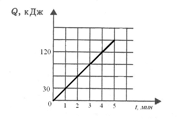 На рисунке представлен график зависимости количества теплоты от времени. Тепло выделяется в спирали сопротивлением 20 Ом, включенной в электрическую цепь. Определите силу тока в цепи.
