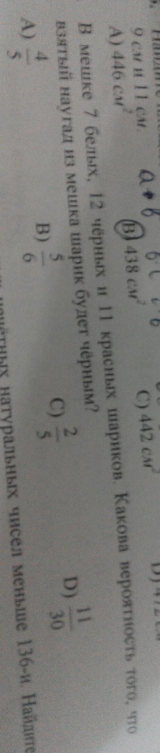 Правильный ответ С). Чёрных шариков 12 и общая сумма всех шариков 30..Получаем дробь 12/30 и сокращаем его на 6 выходит 2/5