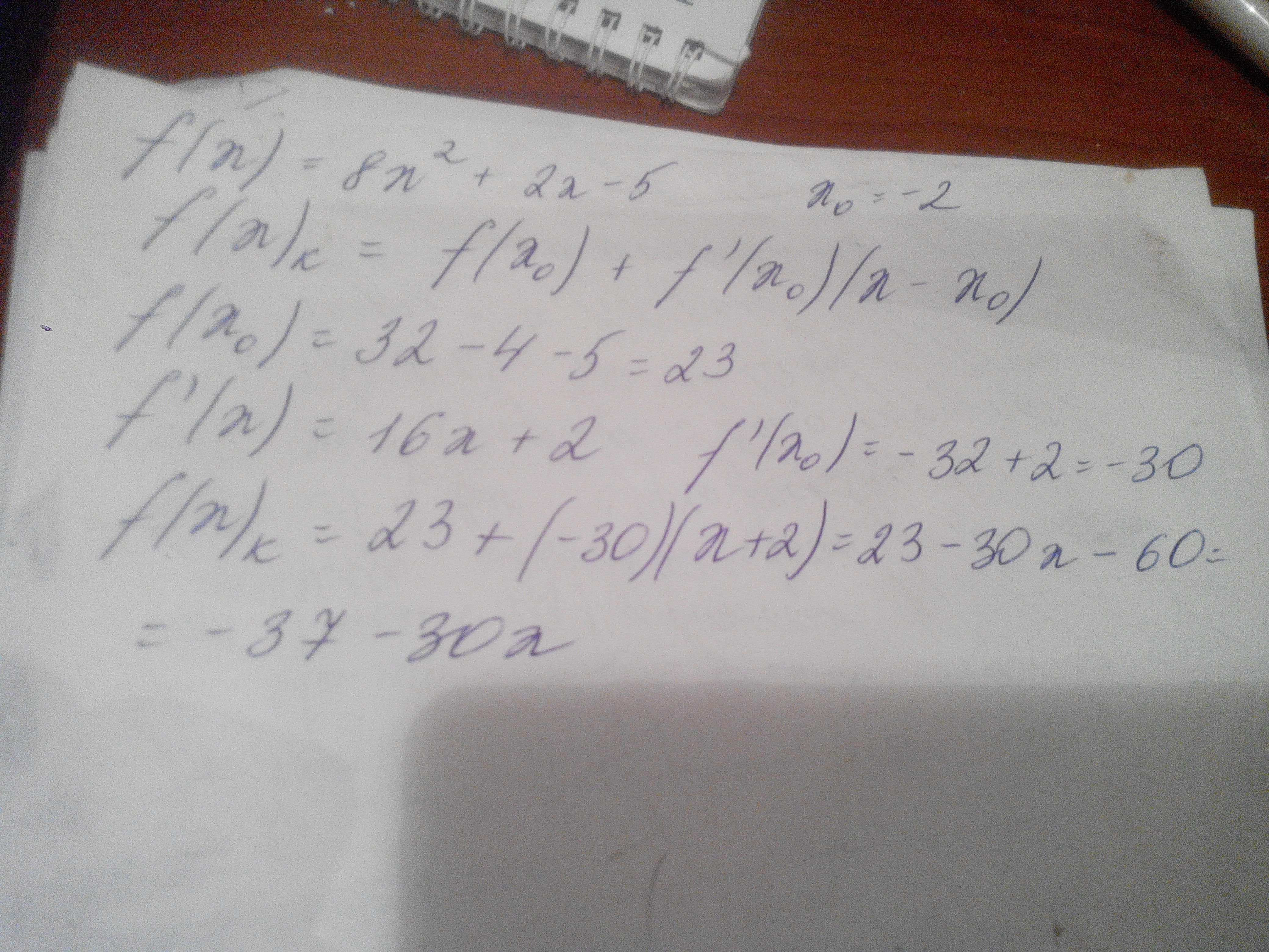Напишите уравнение касательной к графику функции f в точке с абсциссой Х нулевое: f(x) = 8x(в квадрате) +2x - 5, Х нулевое = -2