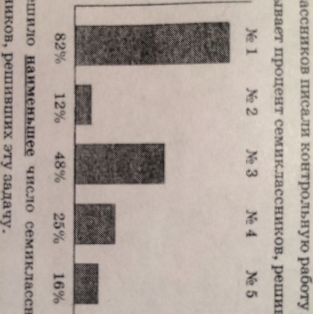 восемьсот семиклассников писали контрольную работу по физике из 5 задач Диаграмма показывает процент семиклассников, решивших каждую из задач. какую задачу решило наименьшее число семикласснико? в ответ запишите число семиклассников, решивших эту задачу. СРОЧНО