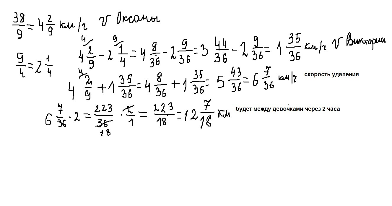 Отворот дачного посёлка по лесной дороге одновременно в противоположных направлениях вышли Оксана и Виктория. Скорость Оксаны равна 38/9 км/ч, Виктории - на 9/4 км/ч меньше. Какое расстояние будет между пешеходами через 2 ч?