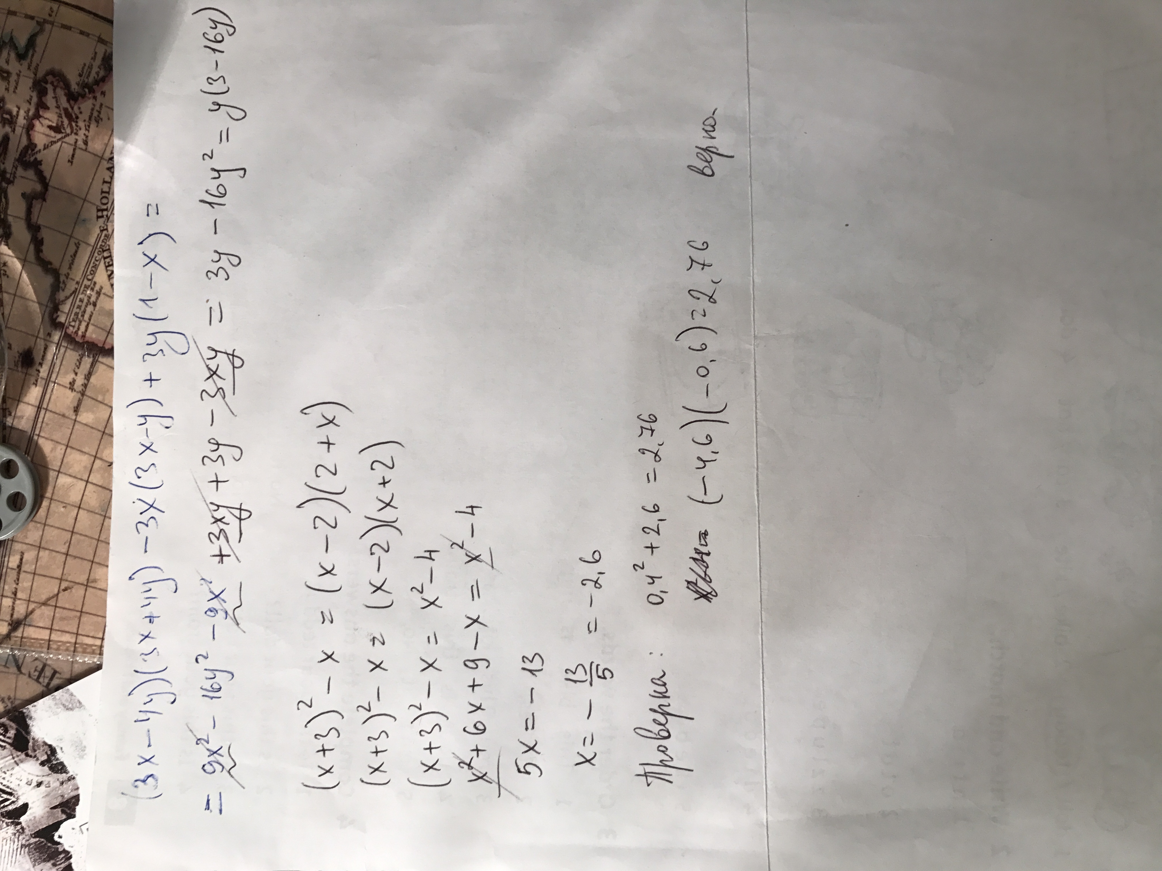 Помогите пожайлуста.1) (3x-4y) (3x+4y)-3x(3x-y)+3y(1-x). 2) решить уравнение.(х+3)^2-х=(х-2)(2+х). Спасибо за ранее помогите прошу