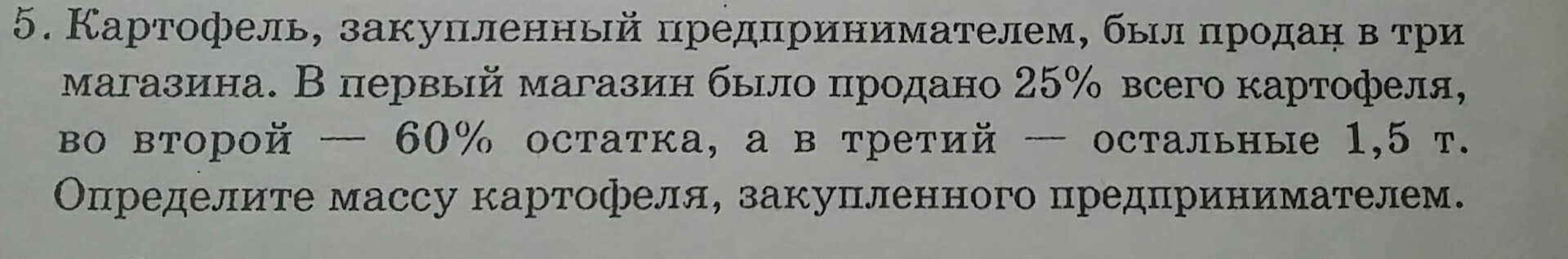 Из вашего условия следует, что в третий магазин было продано 1.5 тонны картофеля и это является 15% от общей массы, следовательно, было закуплено предпринимателем 10 тонн картофеля.
