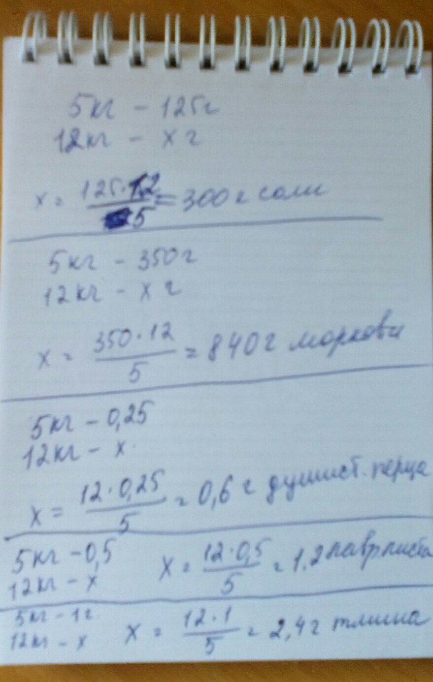 Для квашения 5 кг капусты надо взять 125 г соли, 350 г моркови, 0,25 душистого перца , 0,5 лаврового листа, 1 г тмина. Сколько потребуется этих продуктов и специи для квашения 12 кг капусты?