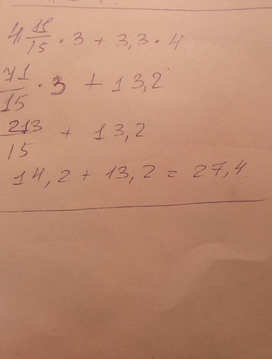 Найдите значение выражения: 4 11/15*3+3.3*4