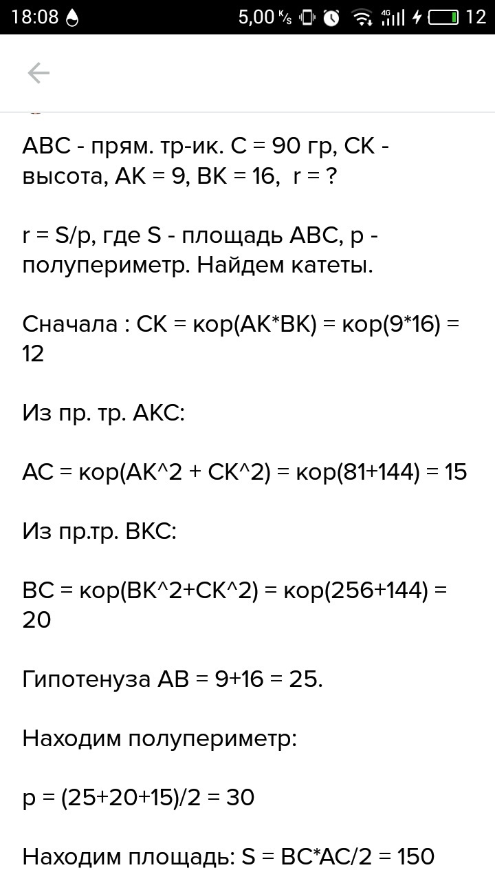 проекция катетов на гепотенузу равны 16 см и 9 см , найдите площадь данного прямоугольного треугольника