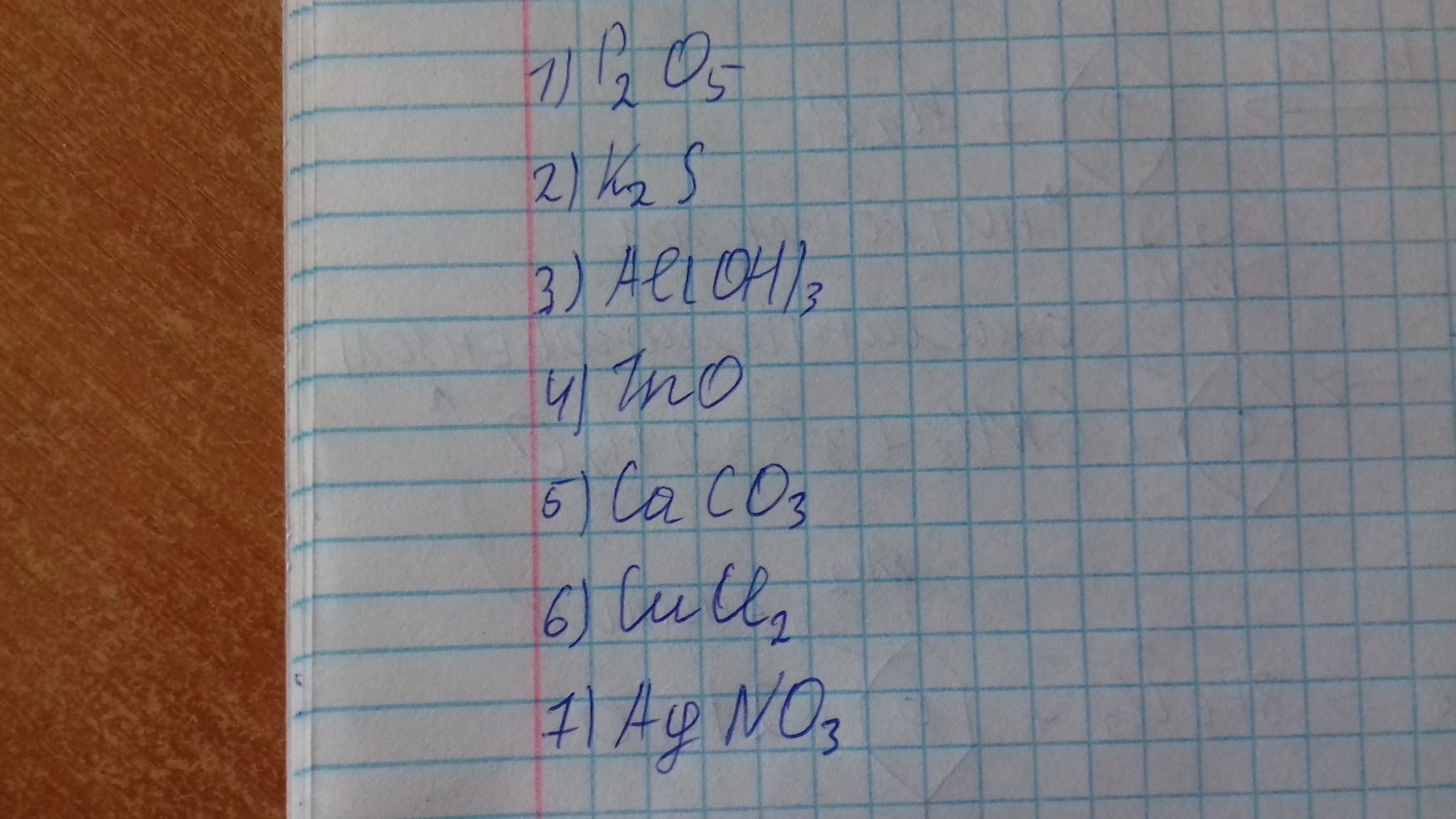 составьте молекулярные формулы веществ:оксид фосфора(v),сульфид калия,гидроксид алюминия, оксид цинка, карбонат кальция, хлорид меди(||), нитрат серебра
