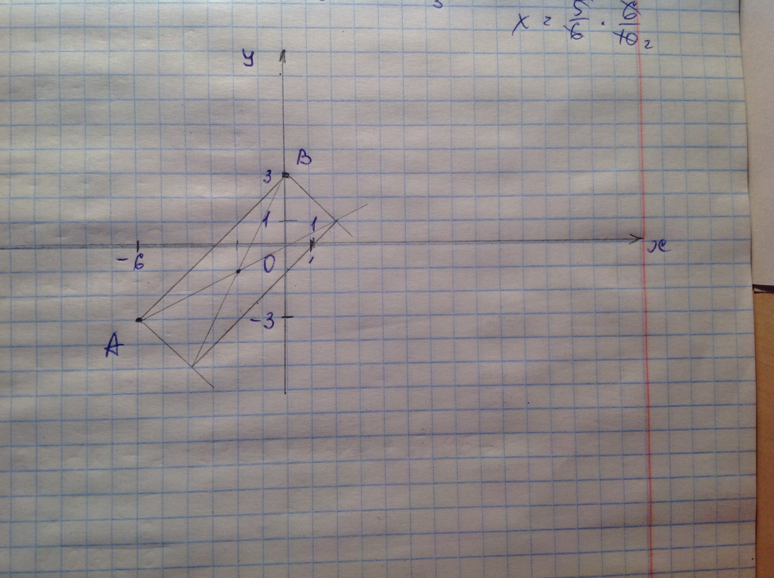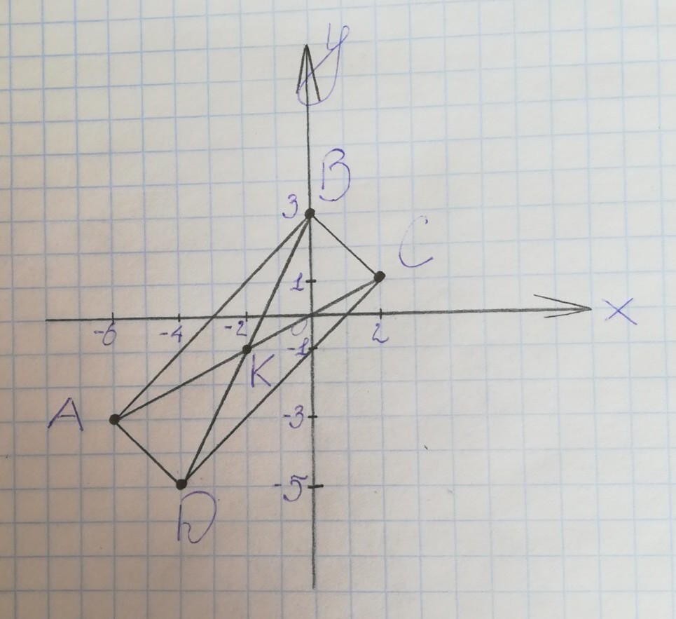 На координатной плоскости построить прямоугольник ABCD, где А(-6;-3) В(0;3), Сторона АВ перпендикулярна ВС, точка пересечения диагоналей К(-2;-1)