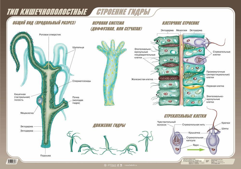 Тканей и органов нет. Два слоя клеток: эктодерма и энтодерма, между ними мезоглея.