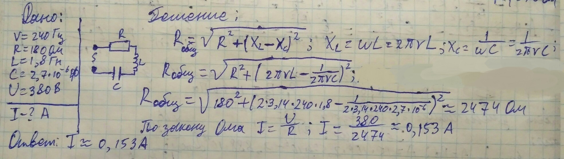 Перевод (RU) Чему равна сила тока в цепи переменного тока при напряжении 380В, частота которого 240Гц, в круг включены активное сопротивление 180Ом, конденсатор емкостью 2,7 10 ^ -6 Ф, и катушка с индуктивностью 1,8Гн?