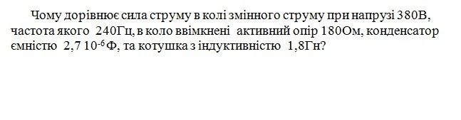 Чому дорівнює сила струму в колі змінного струму при напрузі 380В, частота якого 240Гц, в коло ввімкнені активний опір 180Ом, конденсатор ємністю 2,7 10^-6 Ф, та котушка з індуктивністю 1,8Гн?