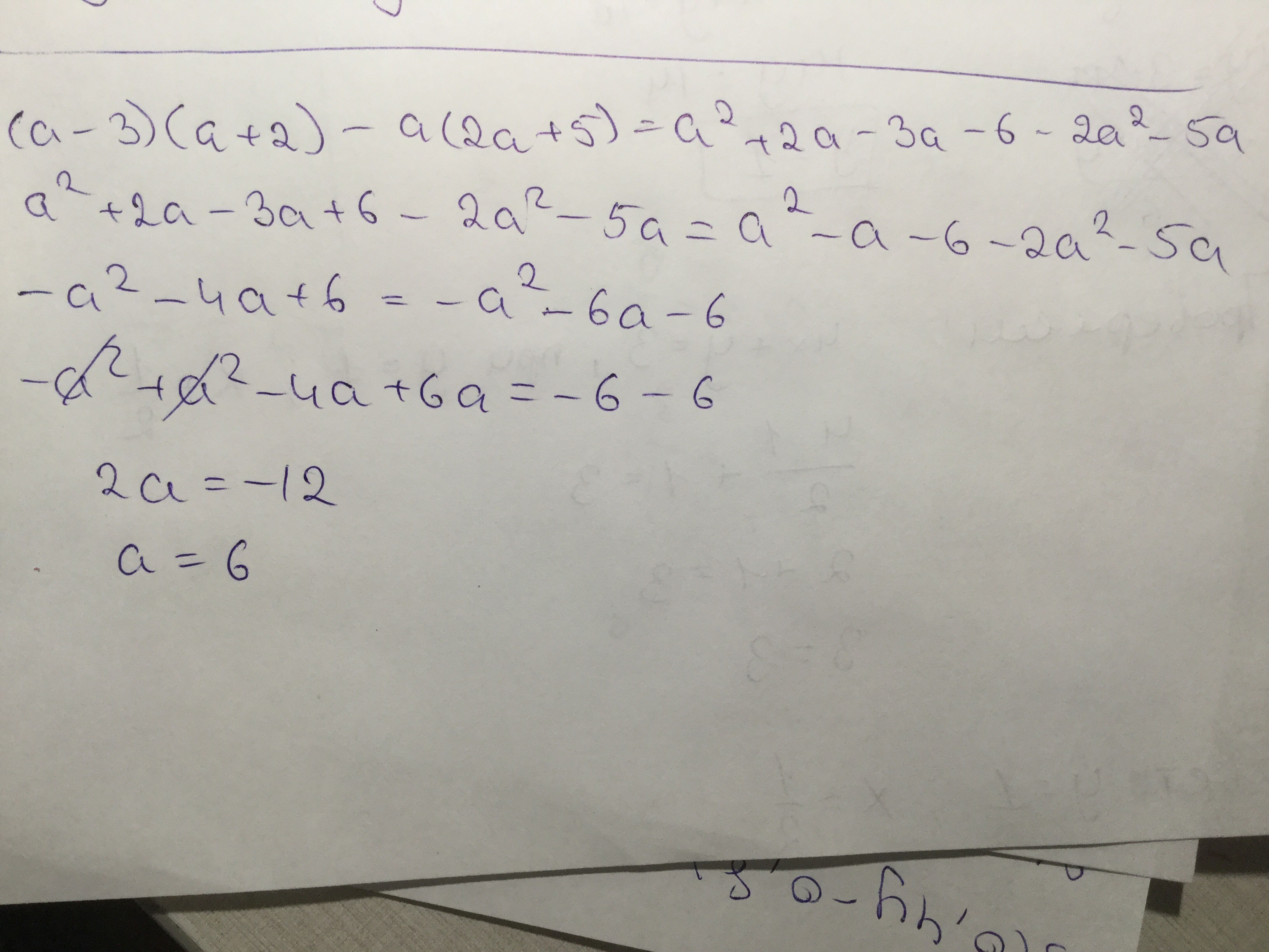 (a-3) (a+2)-a (2a+5)=a квадрат + 2a-3a-6-2a квадрат -5a