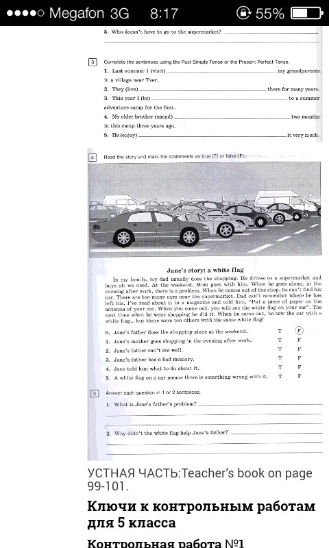 №3 1 visited 2 have lived 3 have been 4 spent 5 enjoyed №4 1F 2F 3T 4T 5F №5 1He can't find his car. 2There were ten other flags with the same white flag.