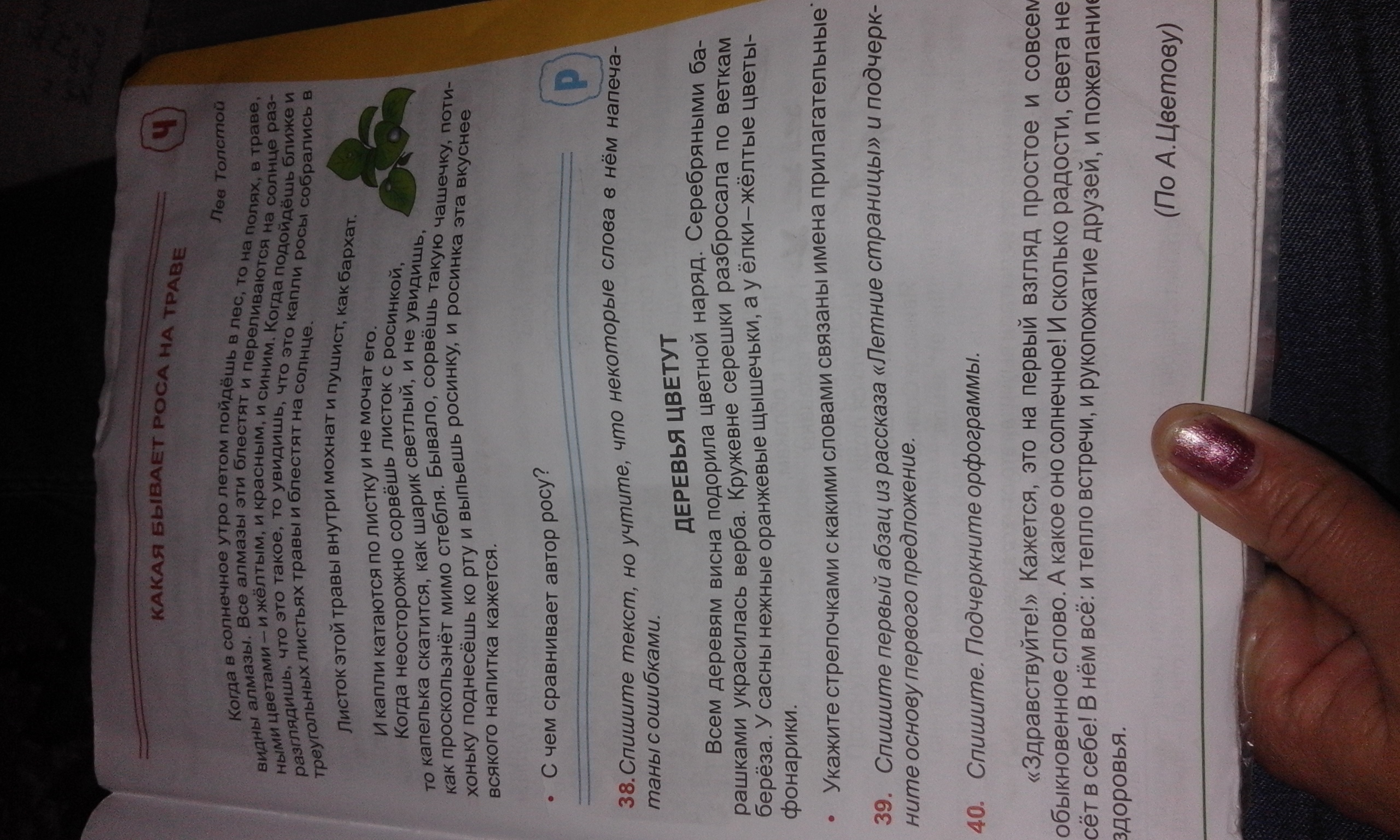 Всем деревьям весна подарила цветной => наряд. Серебряными =>барашками украсилась верба. Кружевные =>сережки разбросала по веткам береза. У сосны нежные оранжевые =>шишечки, а у ёлки - желтые =>цветы-фонарики.