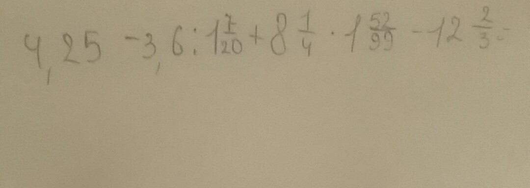 4,25 - 3,6/1 7/20 + 8 1/4 * 1 52/99 - 12 2/3 = 1 7/12