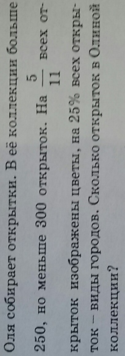 Заметим, что 5/11 от общего числа открыток - целое число открыток, то еть чило открыток делится на 11. 25 % от чила открыток - это 1/4 от чила открыток и это чило целое. Значит, число открыток делится и на 4. Откуда следует, что искомое число делится на 4 * 11 (т.к. они взаимнопросты) = 44. Посмотрим на число, делящиеся на 44: