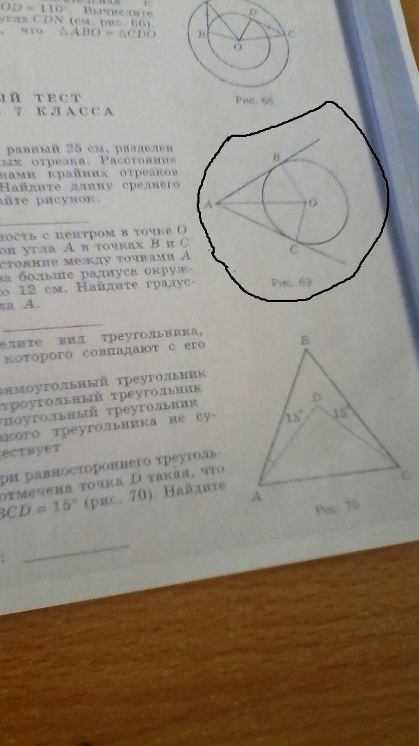 Окружность с центром в точке О касается сторон угла А в точке В и С. Расстояние между точками А и О в два раза больше радиуса окружности и равно 12 см. Найдите градусную меру угла А.