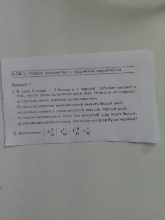 г) Всего возможностей-3, из них белый-2. Получаем 2/3