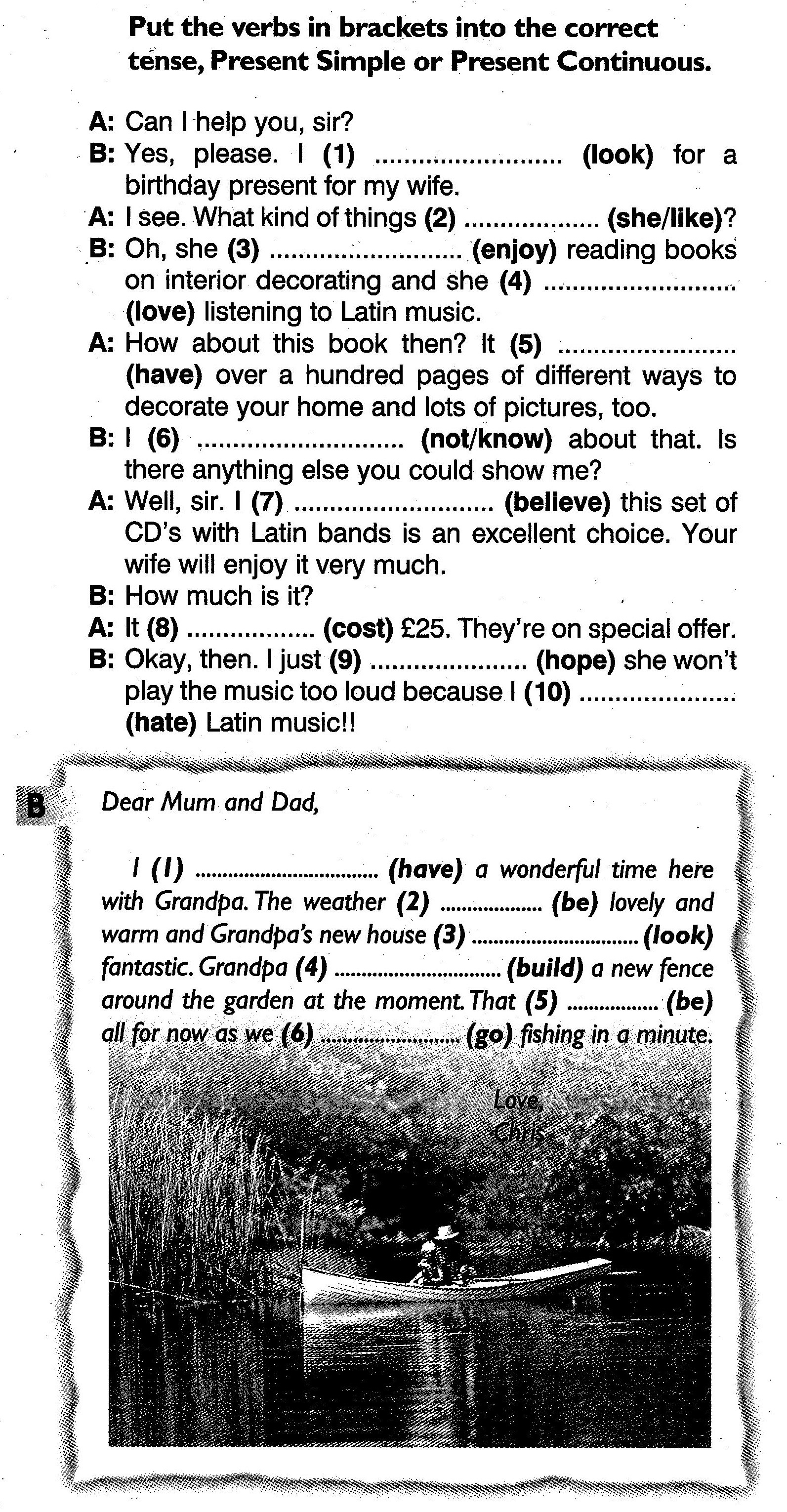I (1) AM HAVING a wonderful time here with Grandpa. The weather (2) IS lovely and warm and Grandpa's new house (3) LOOKS fantastic. Grandpa (4)IS BUILDING a new fence around the garden at the moment. That (5) IS all for now as we (6) ARE GOING fishing in a minute.