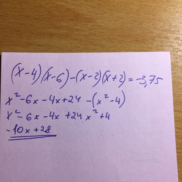 1. Найдите корень уравнения (x-4)(x-6)-(x-2)(x+2)= -3,75