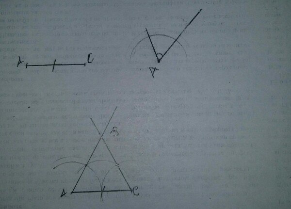 Поставить ножку циркуля в вершину угла А и провести дугу. Потом поставить ножку циркуля в точку А на прямой, которую вы начертили и тоже провести дугу. Измерить расстояние от одной точки до другой, которые образовались из-за пересечения сторон угла А дугой. На отрезке АВ в точке пересечения его и дуги отложить отрезок, равный этому расстоянию. Таким образом мы получим точку, которую можно соединять точкой А. Все эти действия проделываем со вторым углом при основании, потому что углы при основании в равнобедренном треугольнике равны.