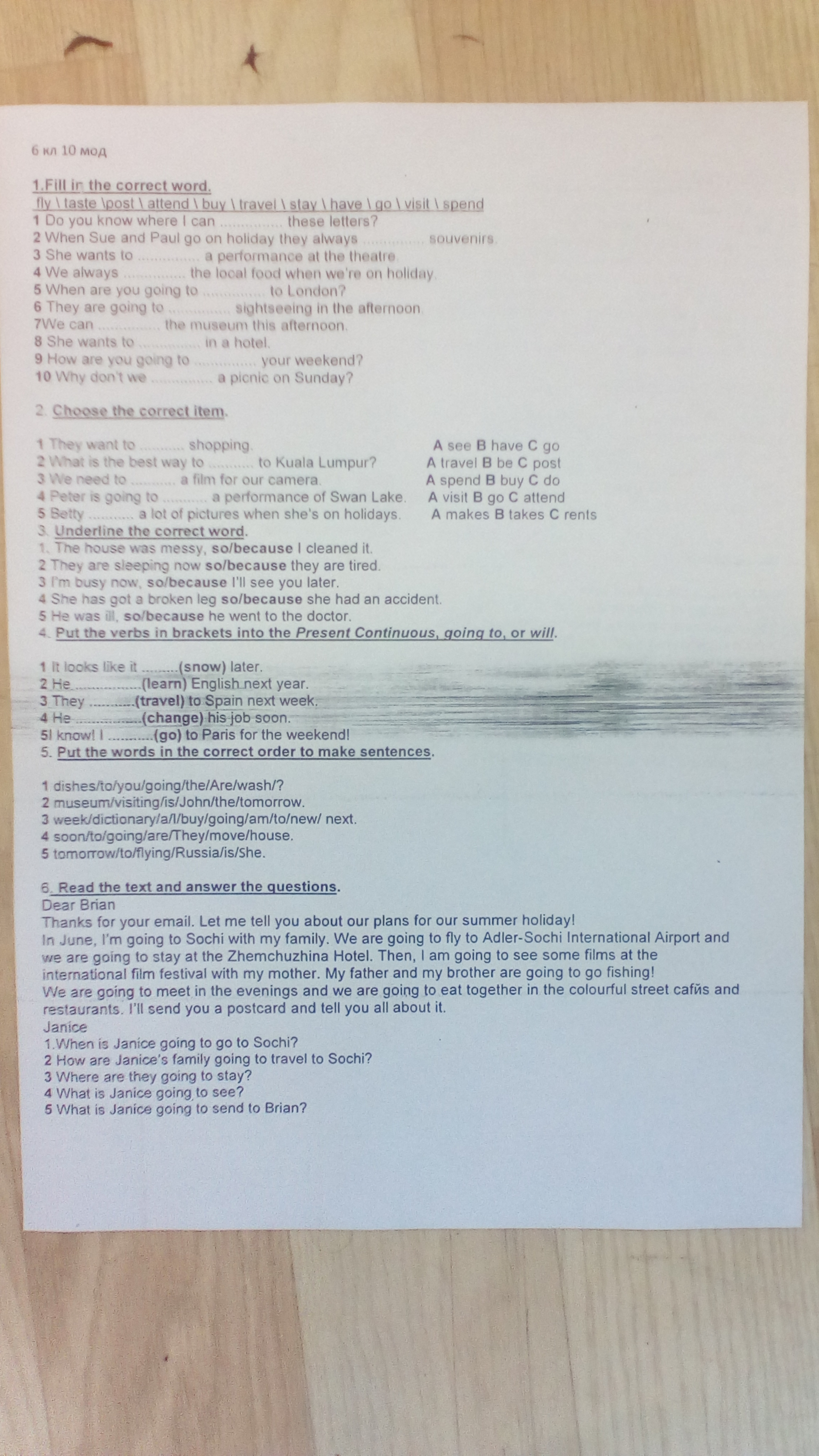 №1 1POST 2BUY 3 attend 4 taste 5travel 6go 7visit 8stay 9spend 10have №2 1C 2A 3C 4C 5B №3 11so 2because 3so 4because 5so №4 1is going to snow 2will learn 3 are going to travel 4will change 5 I am going №5 1Are you going to wash the dishes? 2John is visiting the museum tomorrow. 3 I am going to buy a new dictionary ne[t week. 4They are going to mjve to house soon. 5 She is flying to Russia tomorrow. №6 1in June 2by plane 3at the Zhemchuzhnaya Hotel 4 some films at the international film festival 5 a postcard