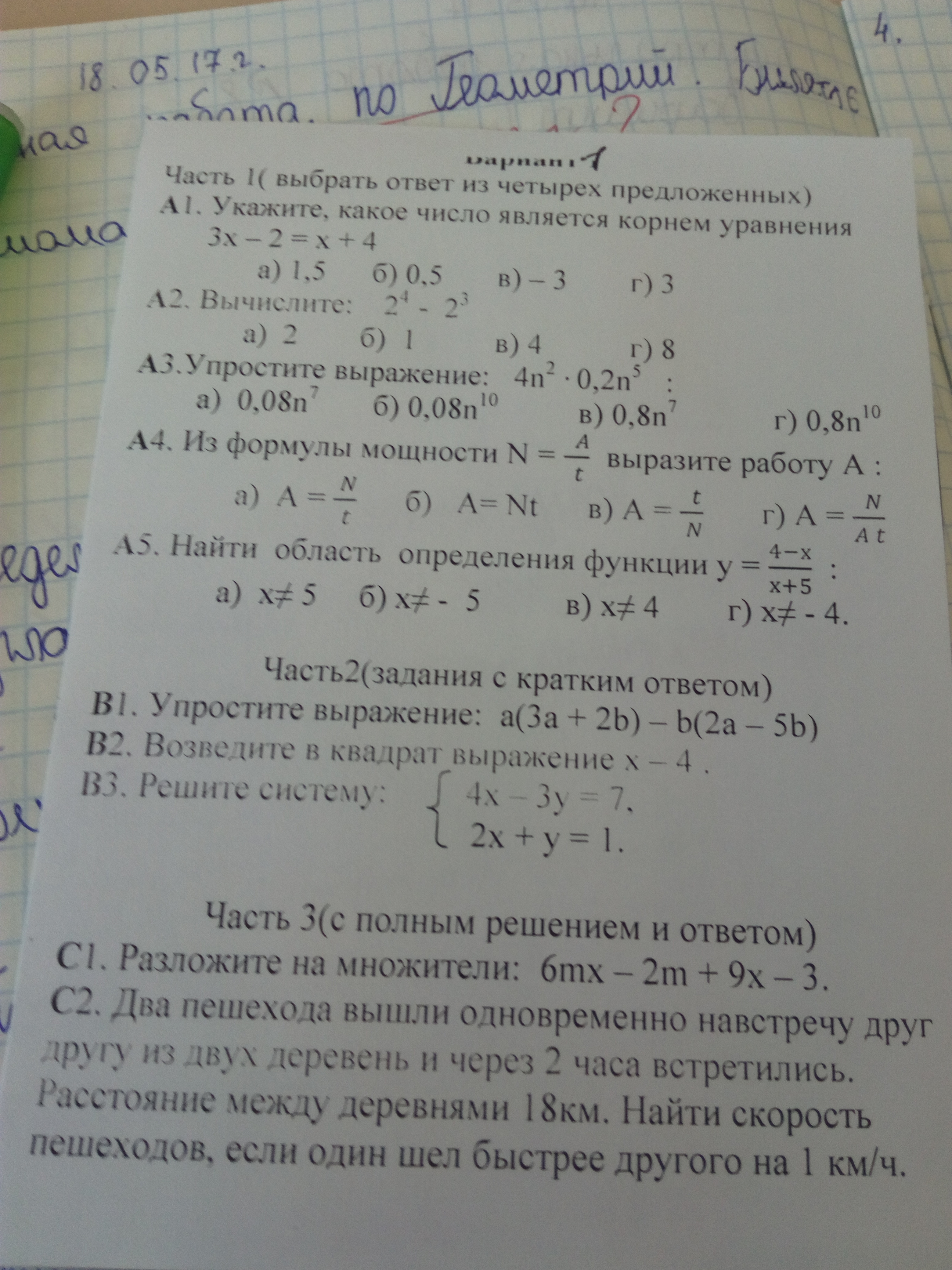 C2. Пусть скорость первого пешехода – x. Тогда скорость второго пешехода – x+1. Расстояние, пройденное первым – 2*x, расстояние, пройденное вторым – 2*(x+1)=2x+2. В сумме они прошли 18 км, то есть 2x+(2x+2)=18. Отсюда 4x=16 и x=4. Следовательно, скорость первого пешехода – 4км/ч, скорость второго – 5 км/ч