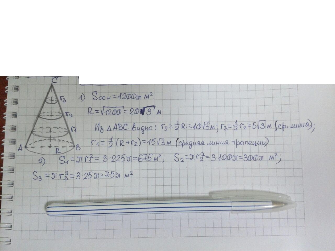 Высота конуса разделена на 4 равные части через точки деления проведены плоскости параллельные основанию. Площадь основания равна 1200 П м^2. Найдите площадь полученных сечений.
