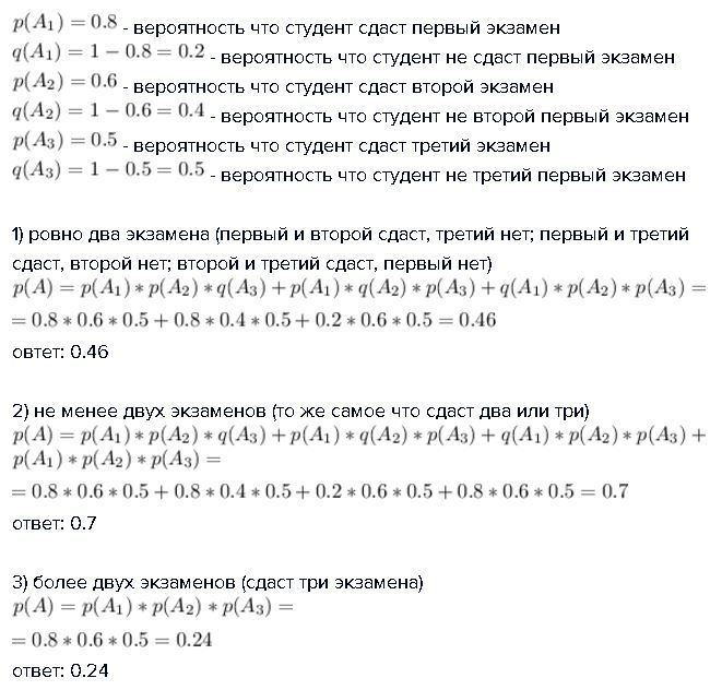1) ровно два экзамена (первый и второй сдаст, третий нет; первый и третий сдаст, второй нет; второй и третий сдаст, первый нет)