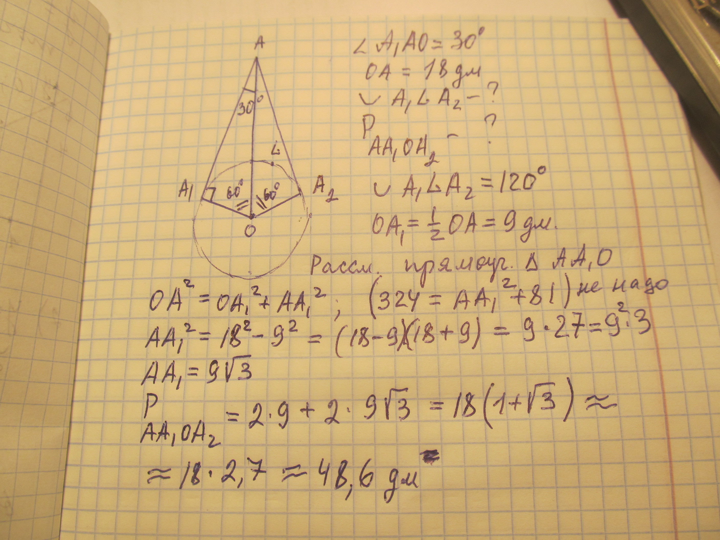 К окружности с центром в точке О проведены две касательные АА1 и АА2, угол А1АО = 30 градусов, ОА - 18 дм. Найдите дугу А1LА2 и периметр четырехугольника АА1ОА2