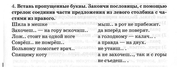 вставь пропущенные буквы. Закончи пословицы, с помощью стрелокстрело соединив части предложения из левого столбика с частями из правого.