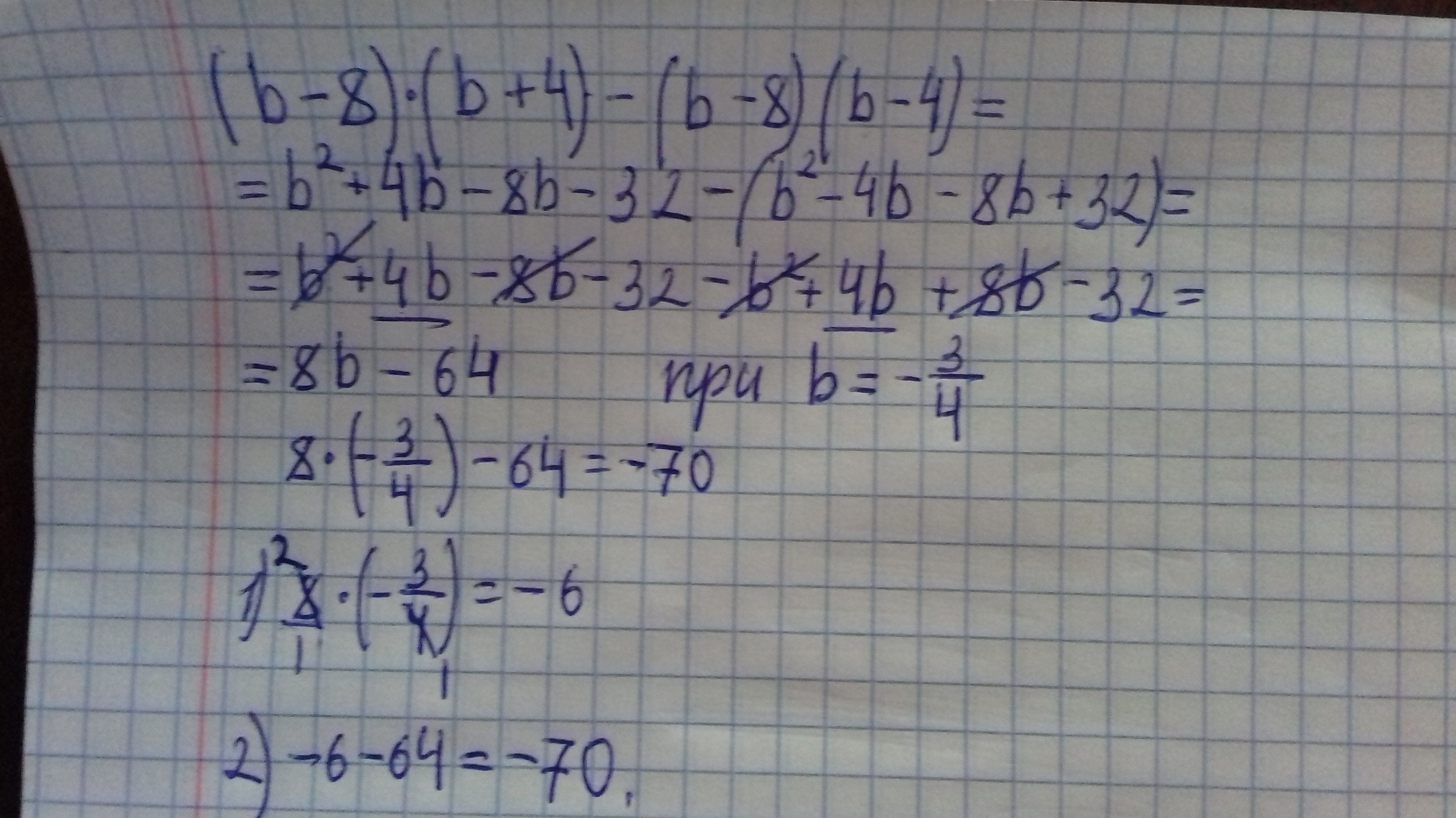Найдите значение выражения (b-8)(b+4)-(b-8)(b-4) при b = -3/4(дробью)