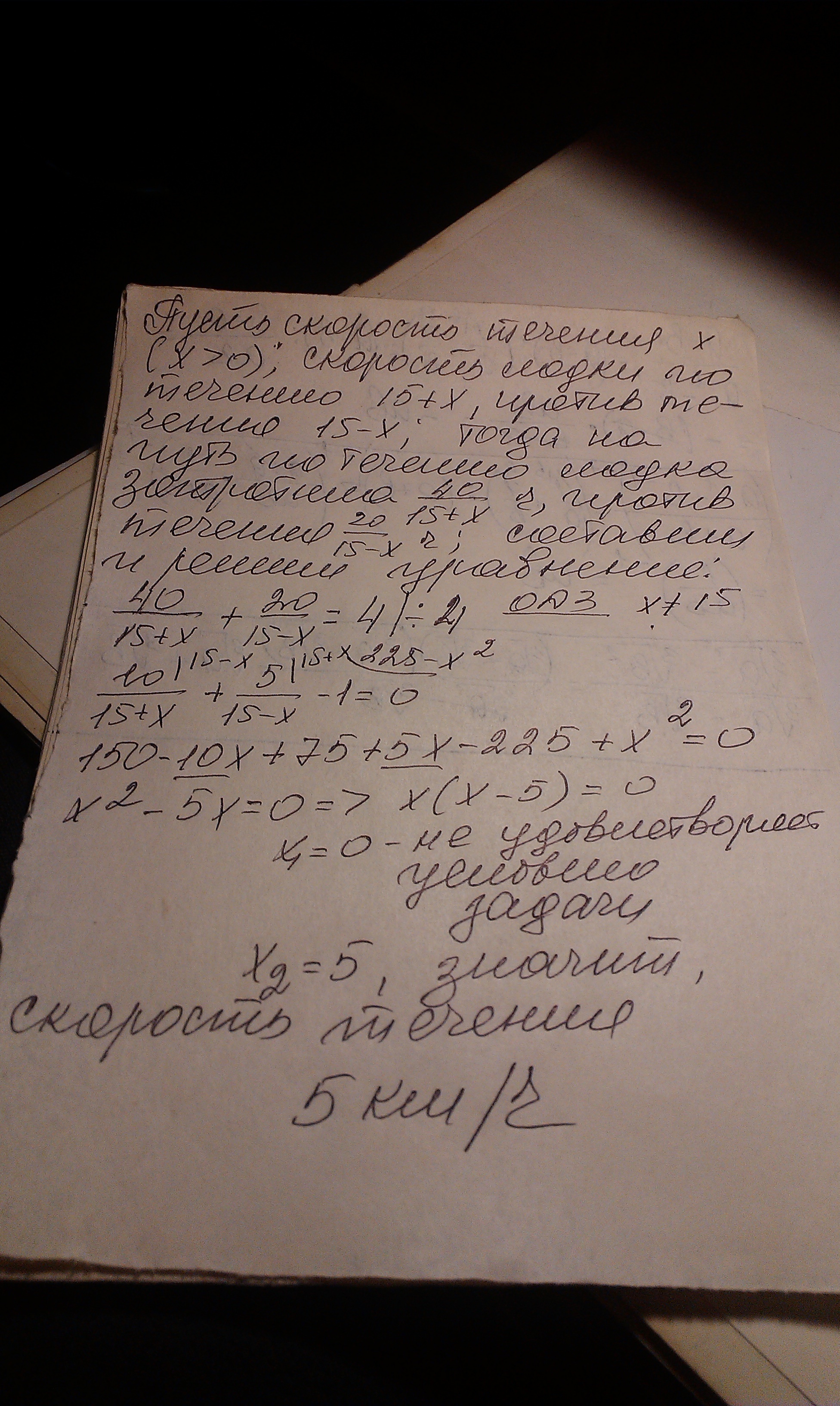 Катер прошел 40 км по течению и 20 км против течения, затратив на весь путь 4 часа. Какова скорость течения реки, если собственная скорость катера равно 15км/ч?