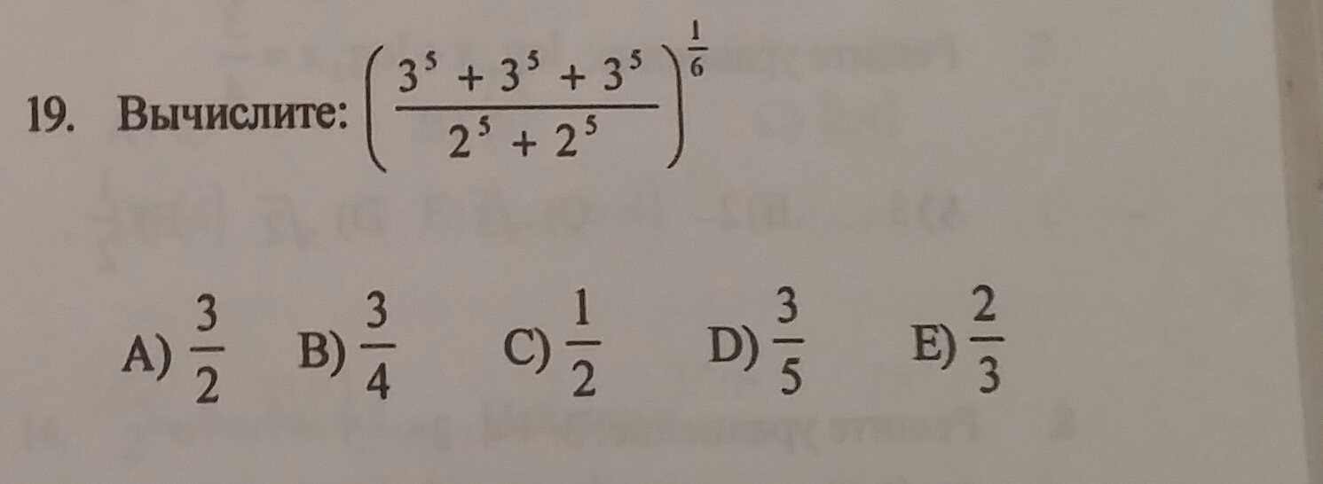 (frac{3^5+3^5+3^5}{2^5+2^5} )^{ frac{1}{6} }=( frac{3*3^5}{2*2^5} )^{ frac{1}{6} }= ( frac{3^6}{2^6} )^{ frac{1}{6} }= frac{3}{2} =1,5