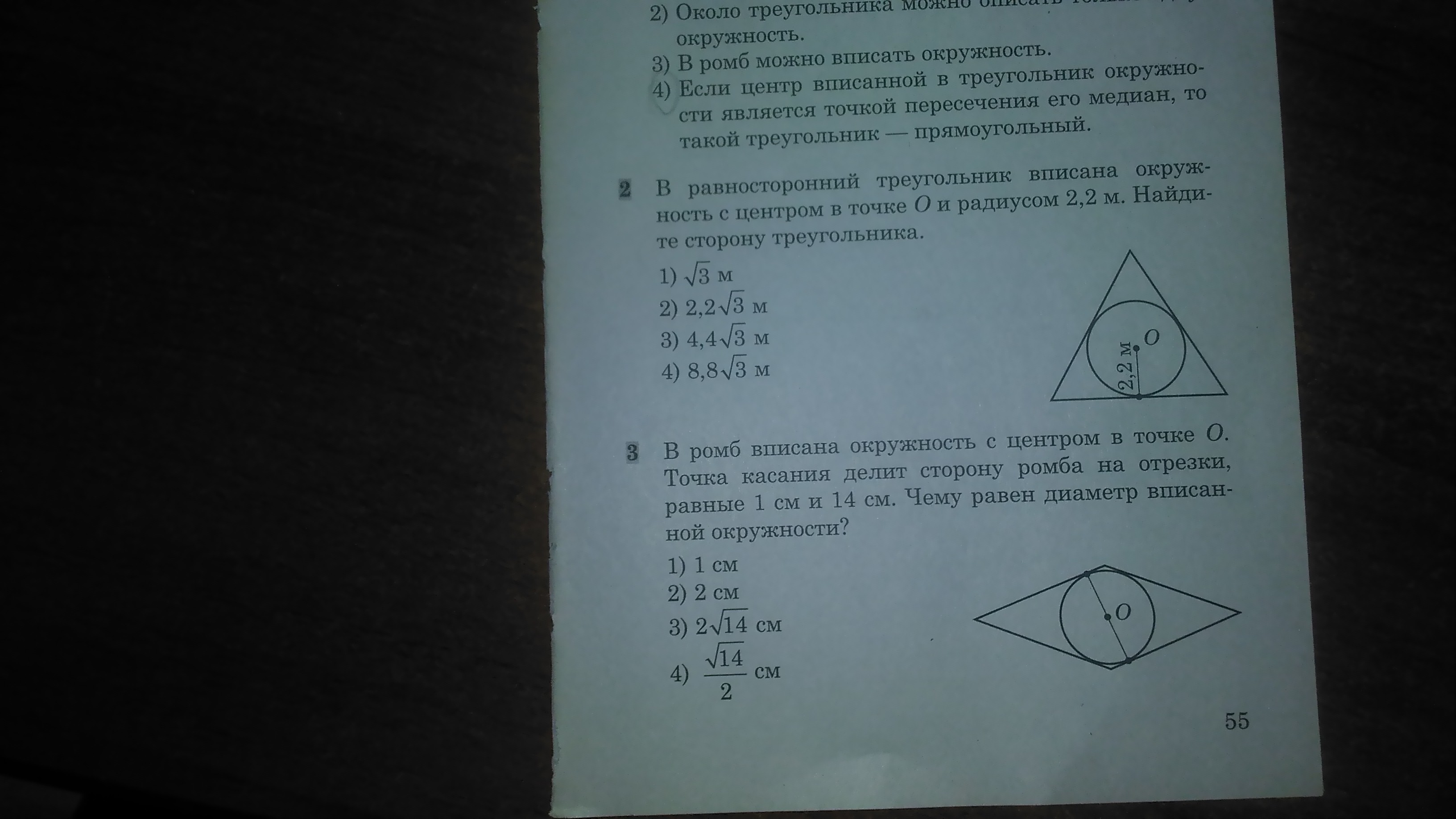 2. Центр окружности, вписанной в треугольник, это центр пересечения биссектрис треугольника. В правильном треугольнике биссектрисы также медианы и высоты треугольника. Радиус вписанной окружности равен 1/3 медианы. Вся медиана (биссектриса и высота) = 2,2*3 = 6,6 (м)
