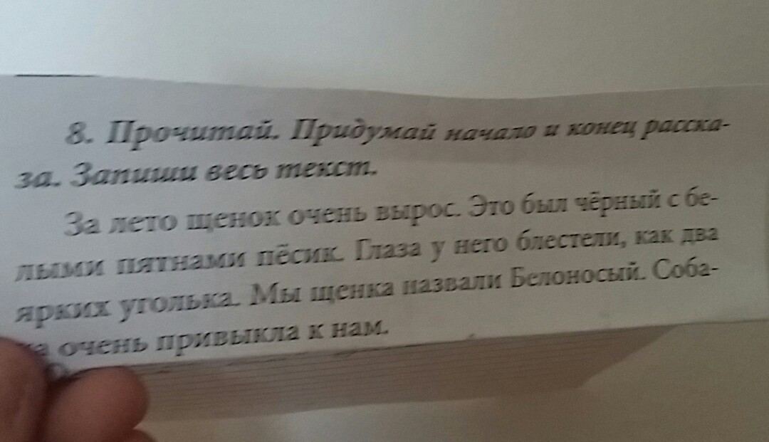 теплым весенним вечером мы с братом гуляли возле озера.Наблюдали за рыбаками.кормили чаек.Вдруг в кустах мы услышали шорох и какие то непонятные звуки.Мы осторожно подошли и раздвинули ветки.нам навстречу выскочил пушистый комочек.Брат вскрикнул:"Щенок!"Действительно.это был совсем крошечный щеночек.он помещался на ладошке.Принесли его домой .дали ему теплого молочка.в коробку постелили мягкую тряпочку и щеночек уснул.Мы стали думать.как упростить родителей и оставить собачку дома.Мама сначала не соглашалась.но щеночек проснулся и так смешно ковырял на маленьких ножках.что мама согласилась.Нашей радости не было предела!У нас есть собака! (вставить текст) Белоносый очень добрый и ласковый.всегда встречает всех возле порога.Очень любит играть с мячиком.а еще он любит смотреть в окно на улицу-это его телевизор.Иногда он повизгивает и виляет хвостом.а иногда рычит.любит "охотиться" на мух.Вот такой у нас замечательный пес.мы его очень любим.