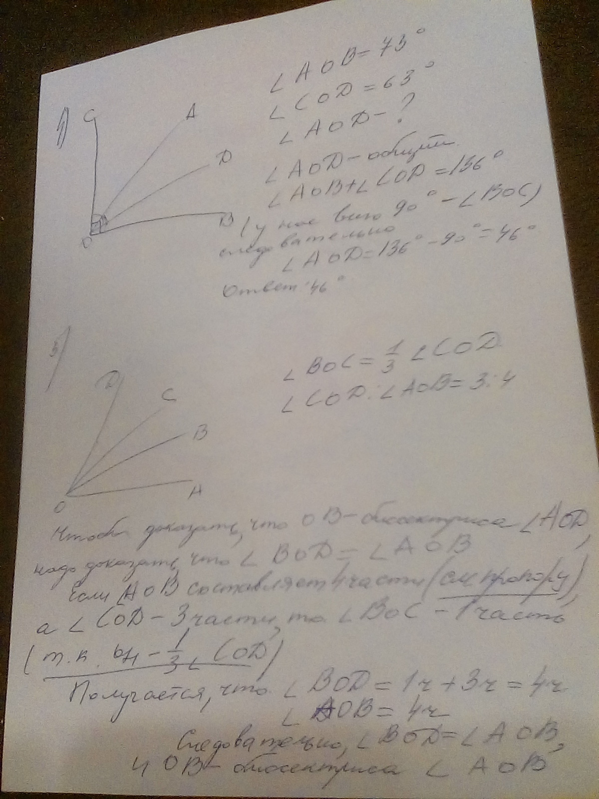 На рис. 33 угол AOC = 77 градусов, угол AOB :угол BOC = 2:5, угол BOC - COD = 12 градусов. Найдите угол AOB, BOC и COD