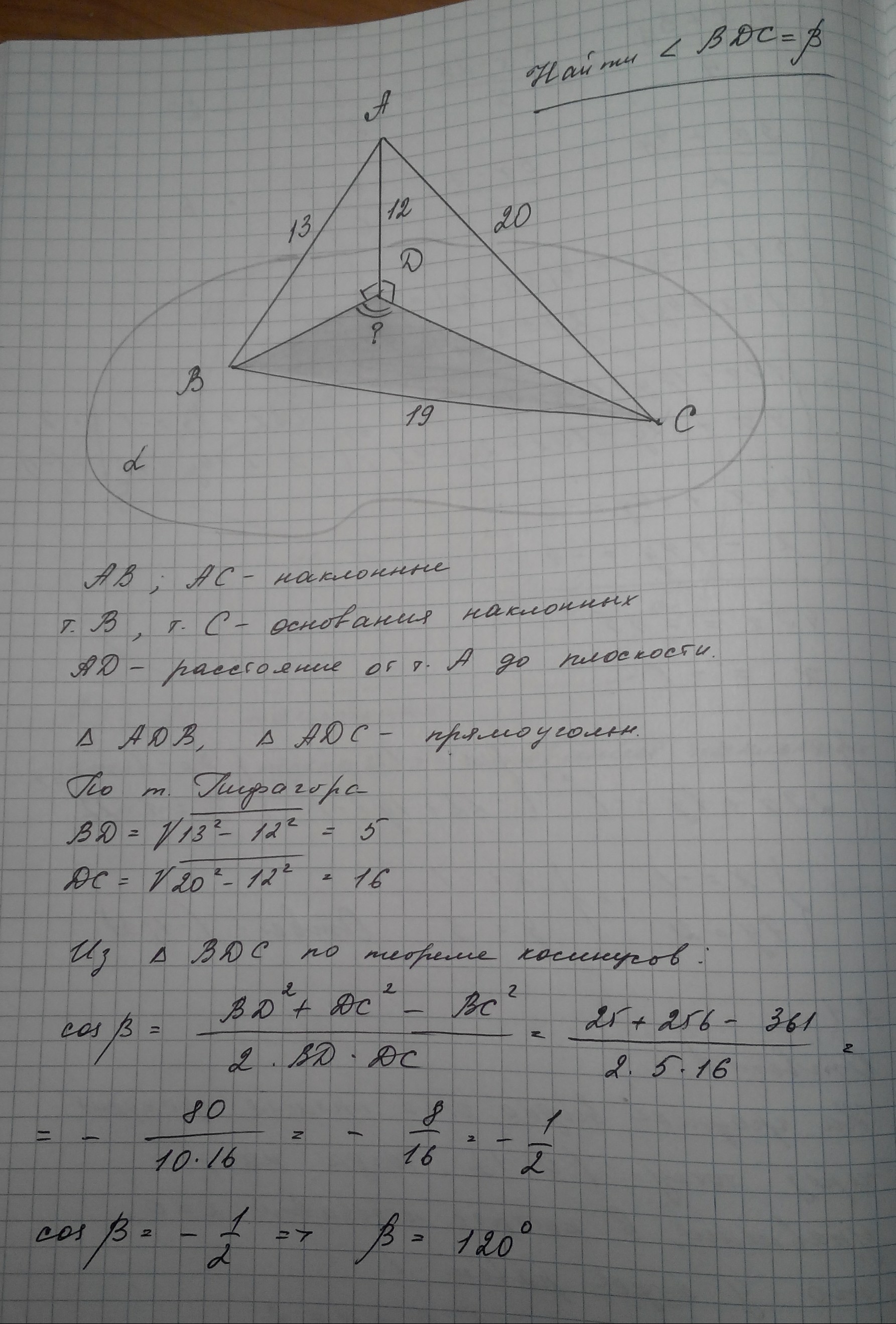 Из точки,удаленной от плоскости на 12 см,проведены две наклонные к этой плоскости, длиною 13 см и 20 см. Расстояние между основаниями наклонных равно 19 см. Найдите угол между проекциями этих наклонных.