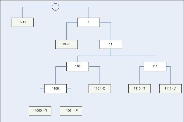 по каналу связи передаются сообщения содержащие 7 букв: п, р, е, с, т, о, л. Для передачи используется двоичный код, удовлетворяющий условию Фано. Для буквы О используется кодовое слово 0; для буквы E используется кодовое слово 10.