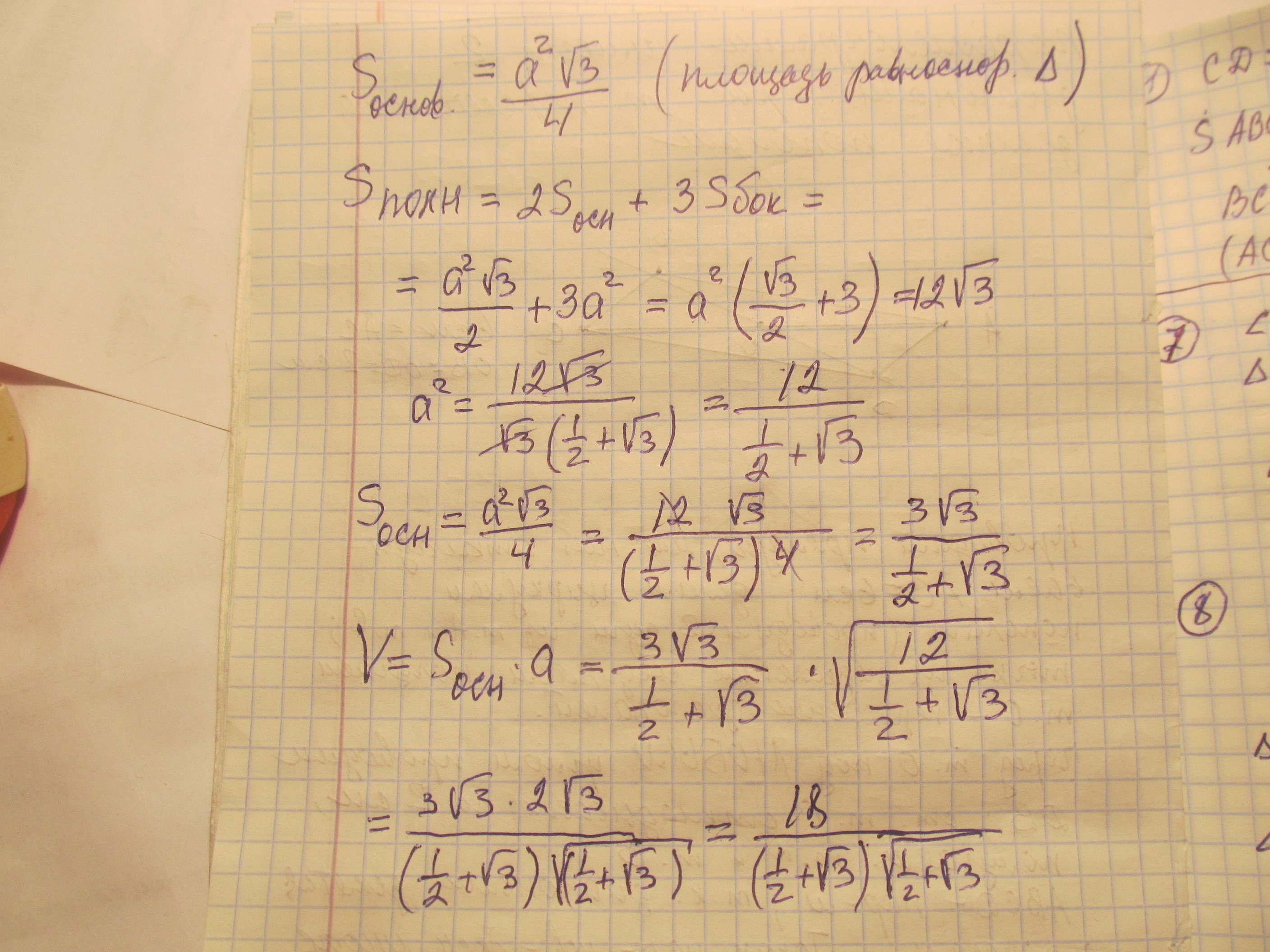 Помогите решить задачу очеень надо....Все ребра правильной треугольной призмы равны. Найти объём если площадь полной поверхности 12корней из 3