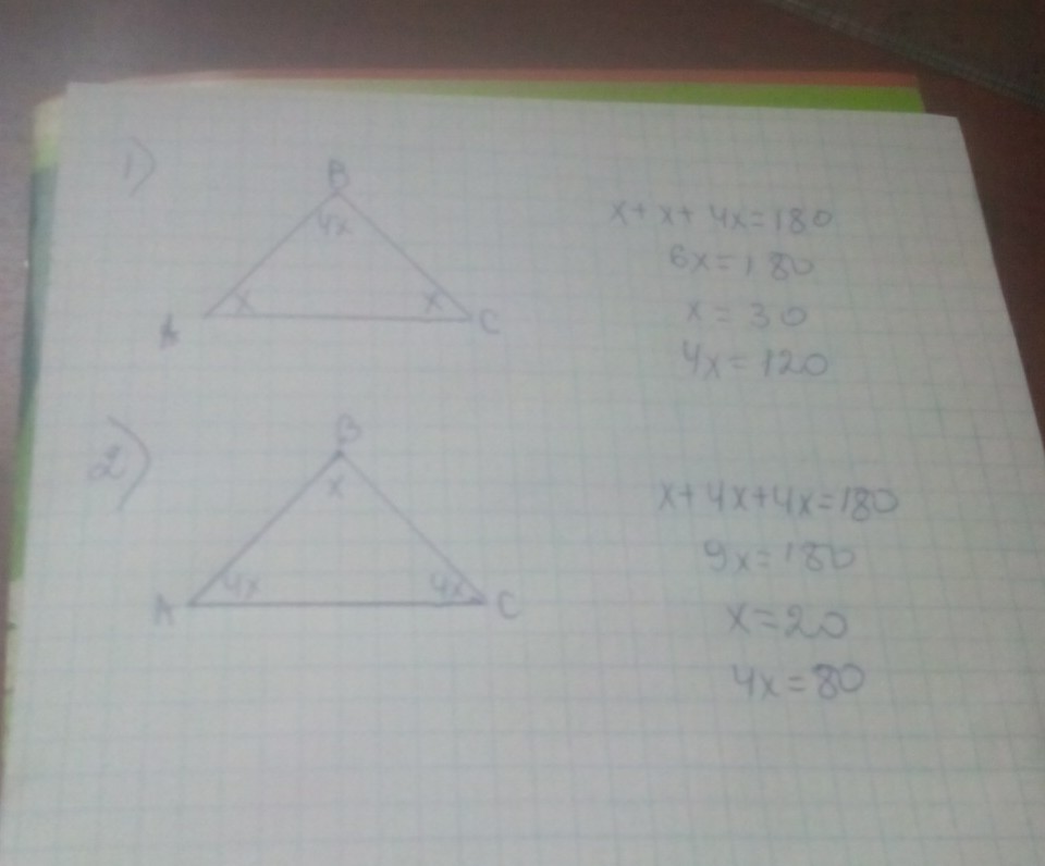 Найдите углы равнобедрого треугольника, если один из его углов в 4 раза меньше другого угла. Расмотрите все возможные случаи.