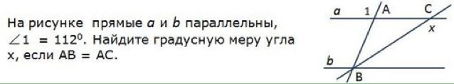На рисунке прямые а и b параллельны, угол 1=112. Найдите градусную меру угла х,если АВ=АС