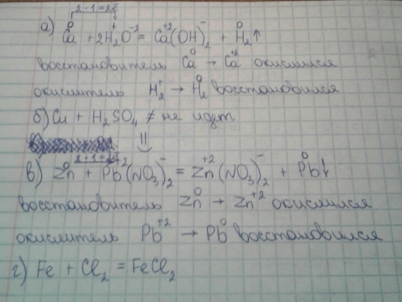 Запишите уравнения возможных реакций на основе предложенных схем. Для двух окислительно-восстановительных реакций составьте схему перехода электронов от окислителя к восстановителю: a)Ca+H2O б)Cu+H2SO4(р-р) в)Zn+Pb(NO3)2(р-р) г)Fe+Cl2