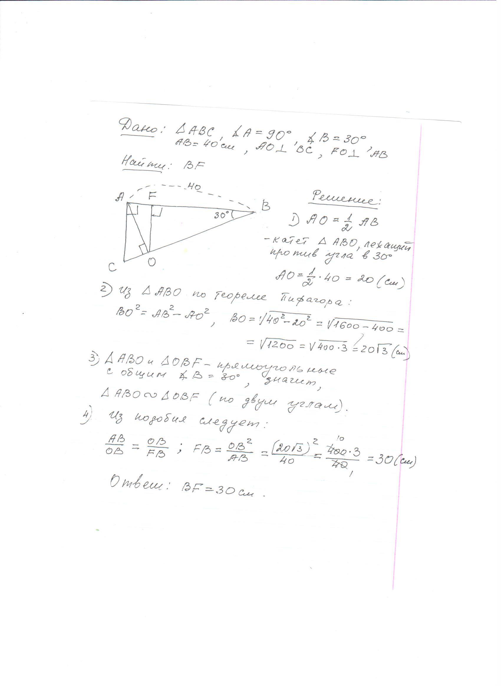 в прямоугольном треугольнике авс угол а—прямой, угол в=30 градусов, ав=40см, ао—высота треугольника авс, fo— высота треугольника аво. Найдите bf