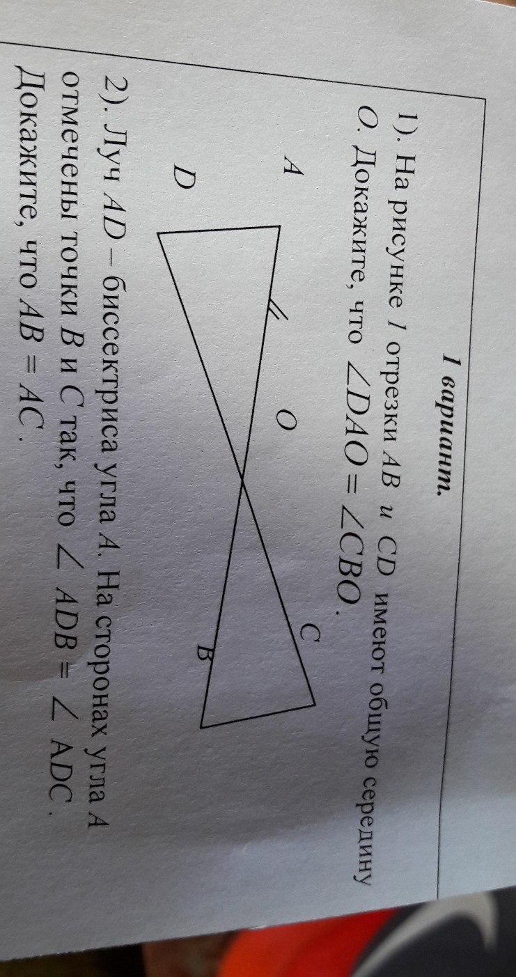 1. Рассмотрим треугольники. По условию- АО=ОВ, СО=ОД. Углы АОД=углу СОВ как вертикальные углы.