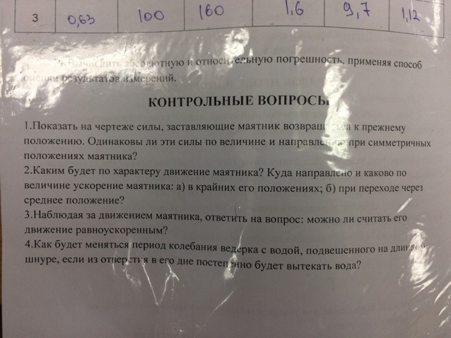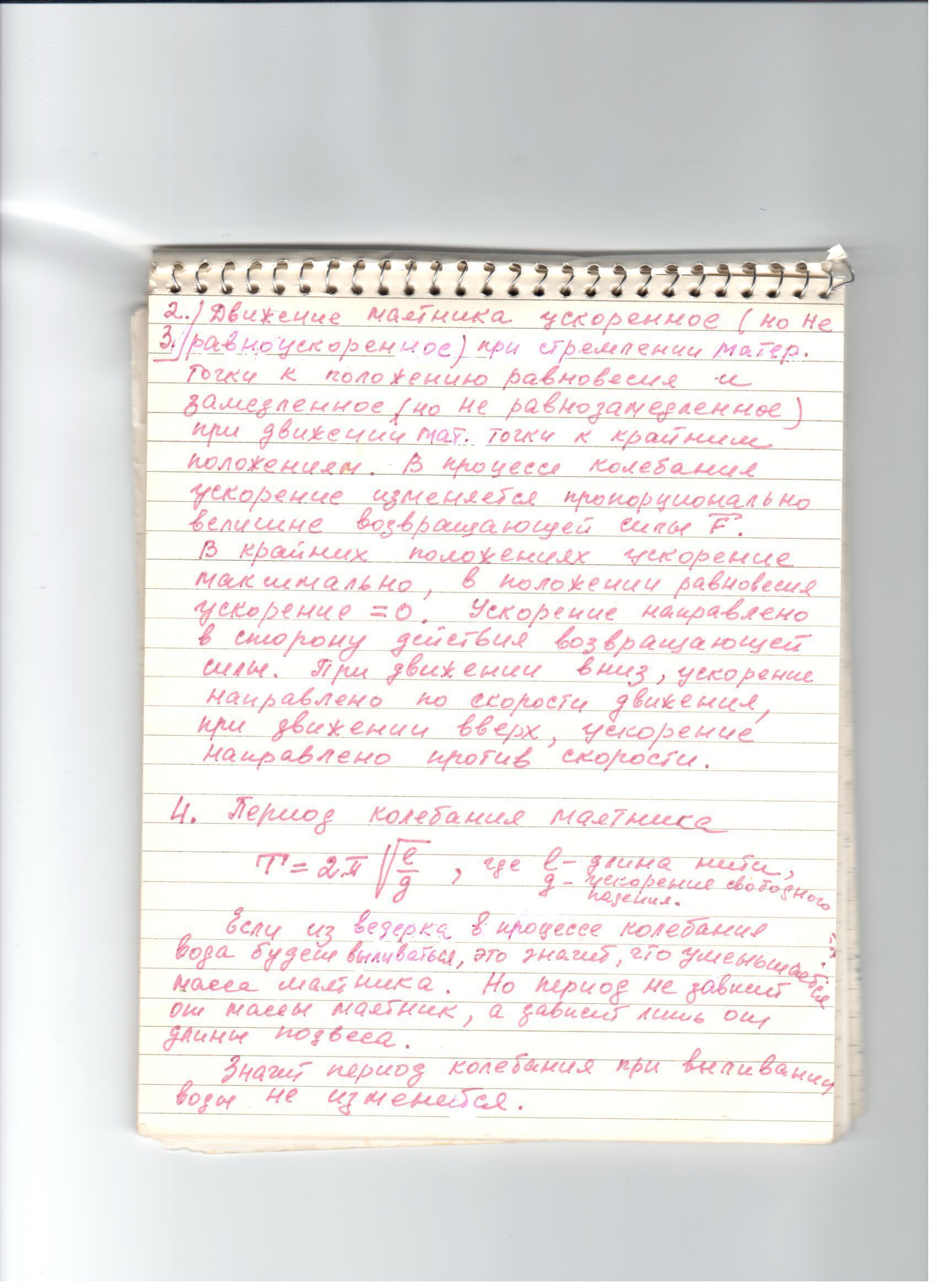 2. Каким будет по характеру движение маятника? Куда направлено и каково по величине ускорение маятника: а) в крайних его ч положениях; б) при переходе через среднее положение? 3.Наблюдая за движением ника, ответить считать его на вопрос: можно ли движение равноускоренным? 4. как будет меняться период колебания ведерка с водой, подвешенного на длин шнуре, если из отверстия в его дне постere но будет вытекать вода?