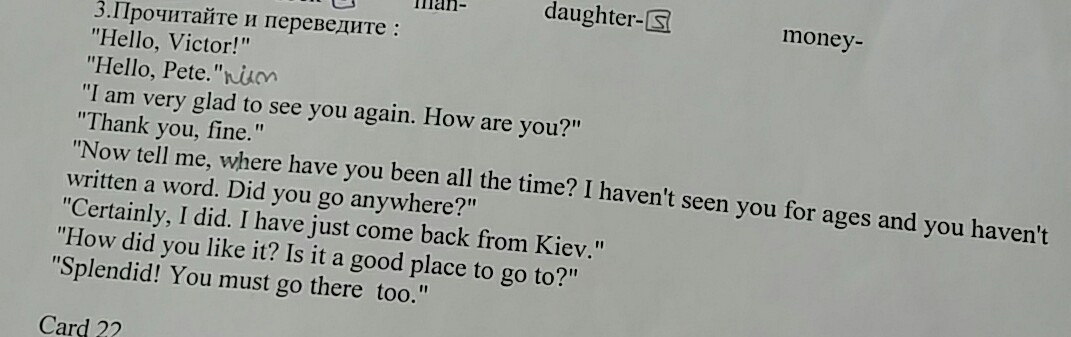 теперь скади мне где,ты был все время?СЯ не видел тебя целую вечность и ты не написал ни слова. Ты ходтл куда-нибудь?Конечно,я сделал . Я только что вернулся из Киева.Как ва понравилось? Это хорошее место.чтобы сьездить?Велеколепное!Вы должны туда поехатью
