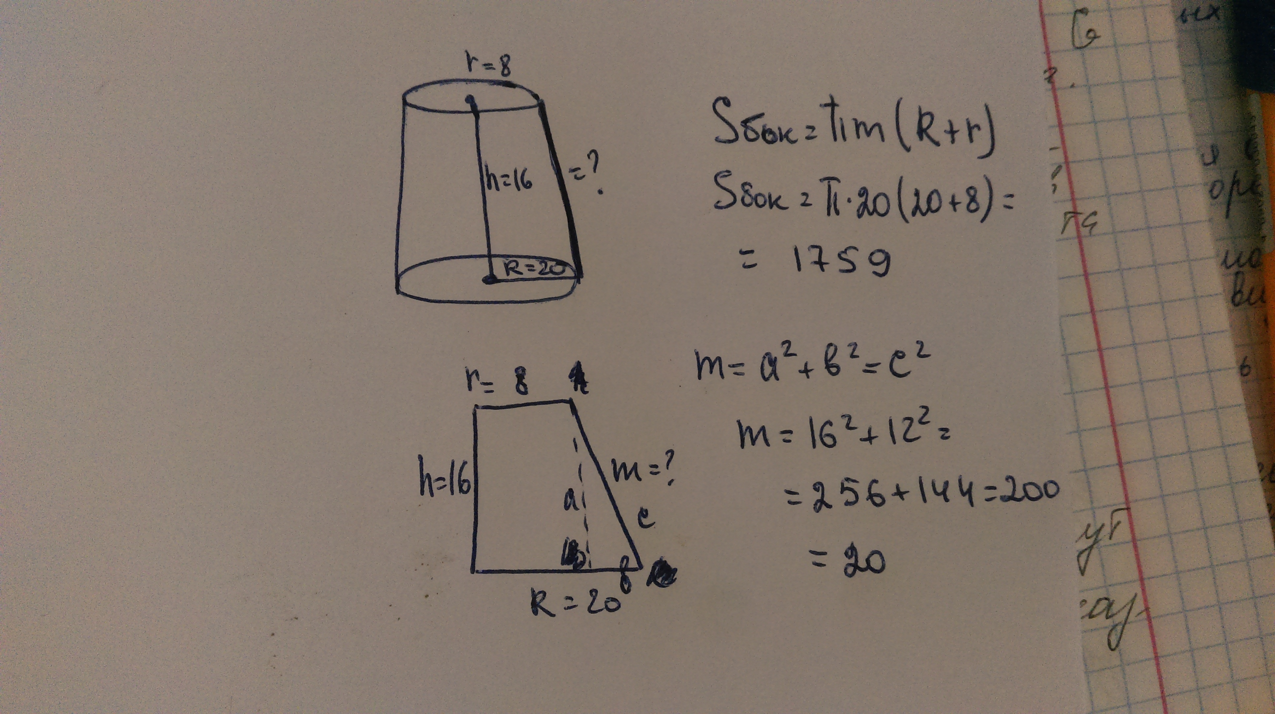 Радиусы оснований усеченного конуса равны 20 и 8 см.Найтм площадь боковой поверхности конуса,если его высота равна 16см