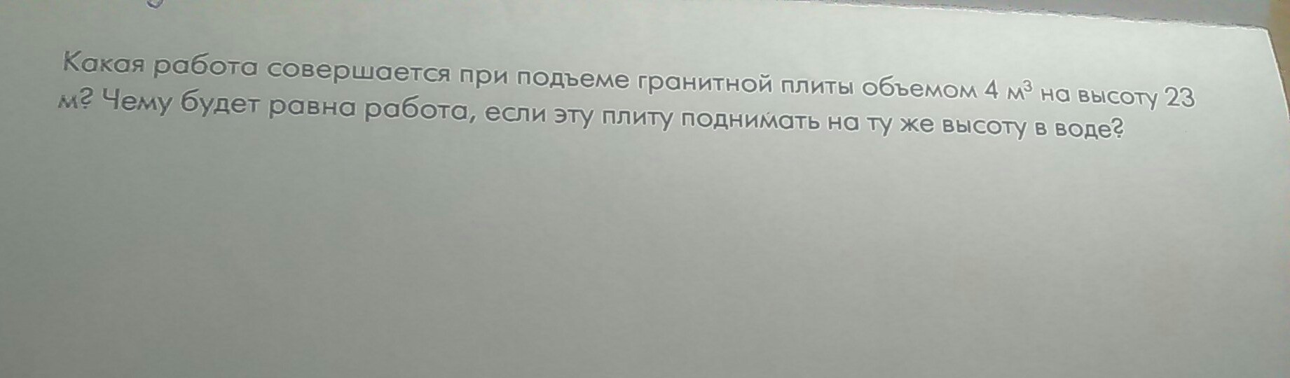 какая работа совершается при подъеме гранитной плиты объемом 4 м3 на высоту 23 М? чему будет равна работа, если пл и у
