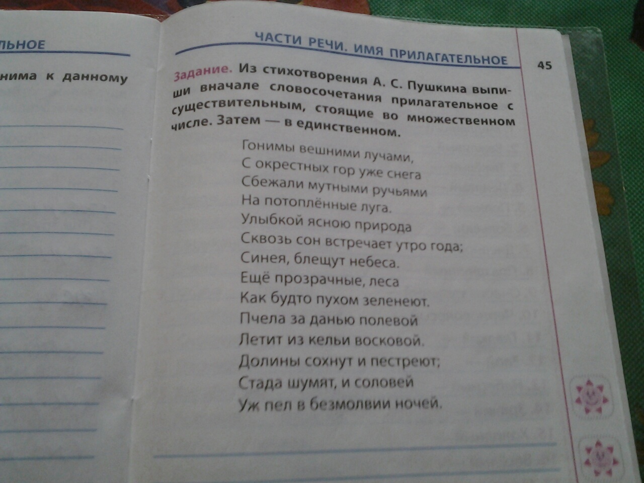 1) вешними, лучами окрестных гор , мутными ручьями, потоплённые луга , прозрачные леса .